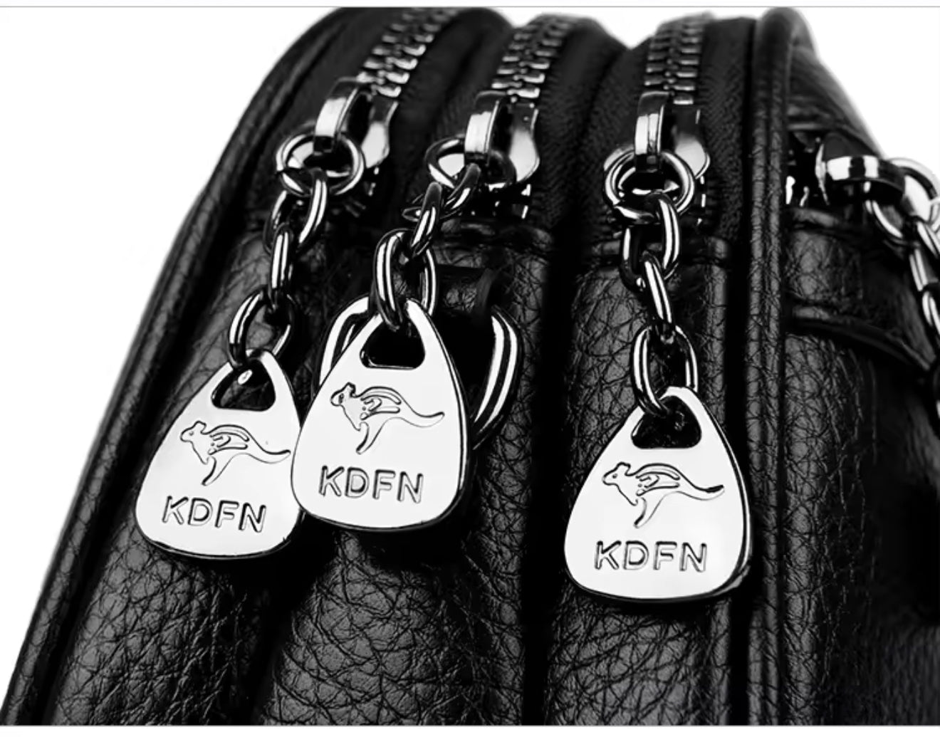 Signature metallic kangaroo logo emblem and polished silver-tone hardware.